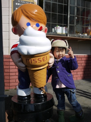 カメラ向けると嫌がってたけど『アイスと写真撮ったら買ってあげる』と言うとノリノリでニックンと記念撮影。
