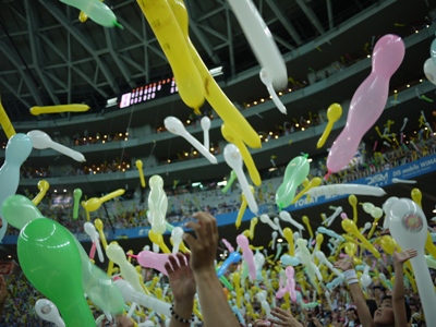 応援傘。2点入ったので7回表も入れて3回振り上げられました。