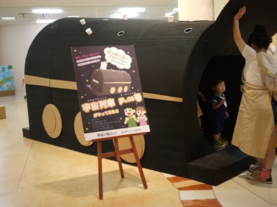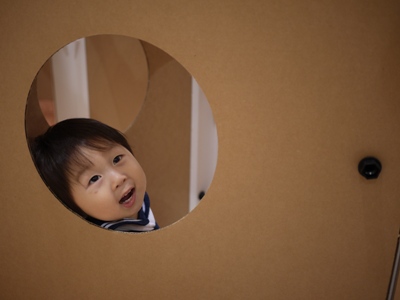 ダンボールで作った‘宇宙列車’に飽きずに乗車。