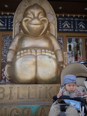居酒屋の前のビリケンさんで。