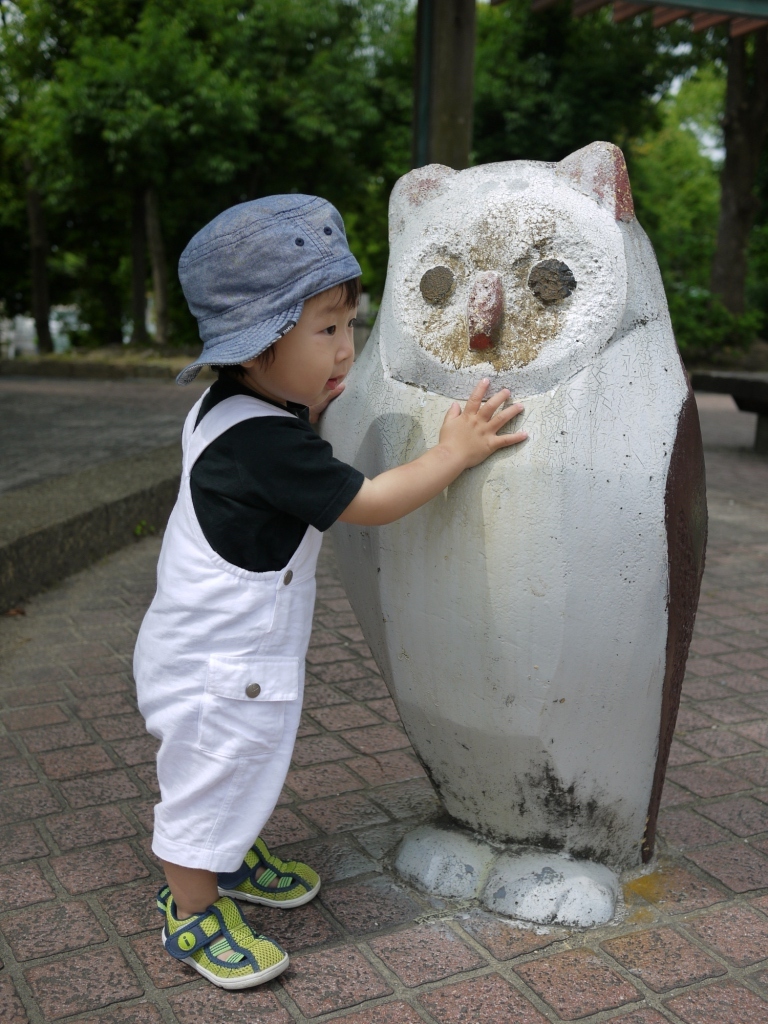 冬にも一緒に撮ったフクロウ。身長の伸びの目安になって良いです。