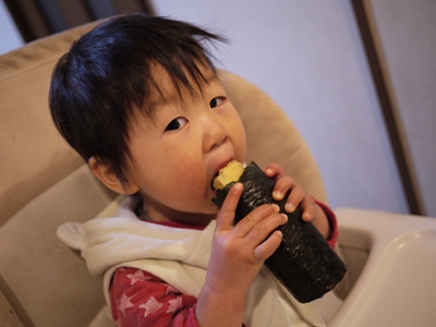 昨年はかぶりついた真似だけでしたが今年はこの後 切ったら半分 食べました。